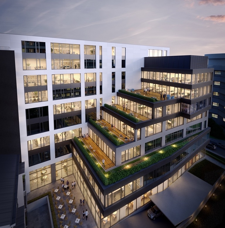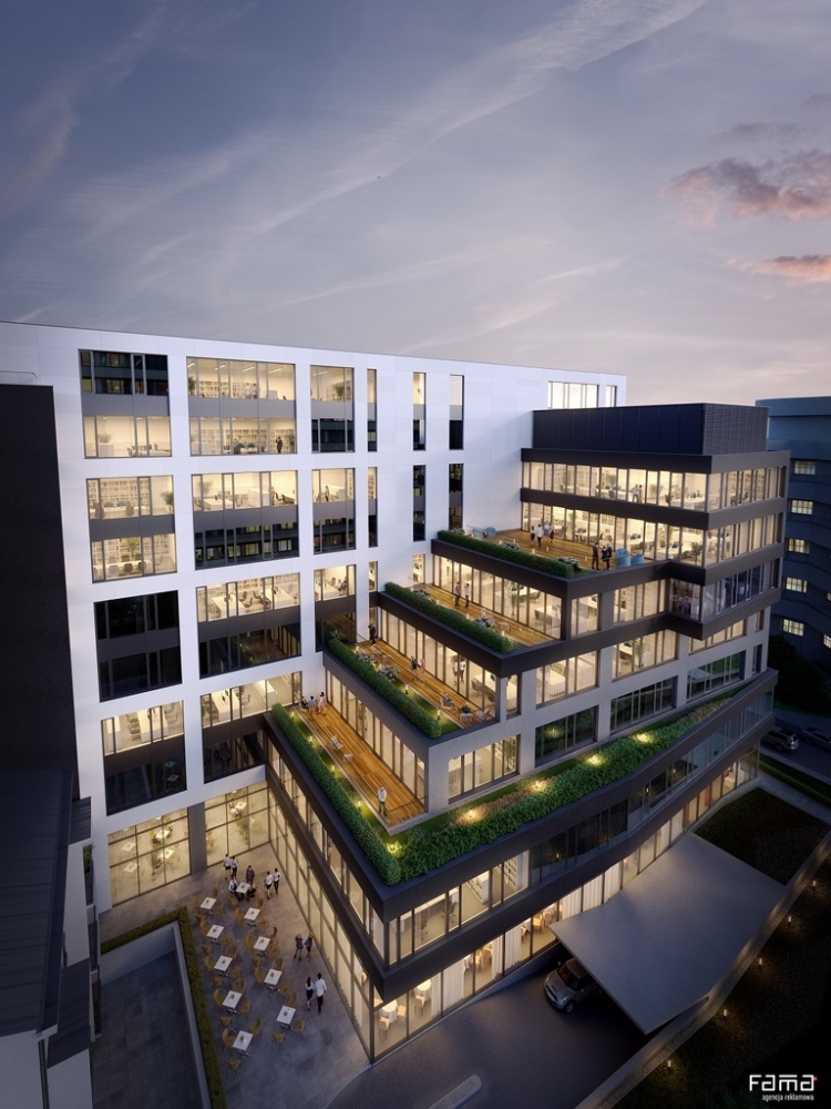 Eight-storey officel complex located near to the center of Cracow, near major transport routes. It offers office and retail space finished with the highest standard and distinguished by good exposure. There are tram and bus stops next to the building. Rondo Mogilskie situated nearby is one of key traffic juunctions of the city. The large glazing space ensures a perfect lighting and the effective airconditioning system ensures the right temperature and humidity. Terraces and green balconies in the building make a good climate and make employees feel better. The investment will offer its tenants over 200 underground parking spaces. The planned date of commissioning is March 2019.