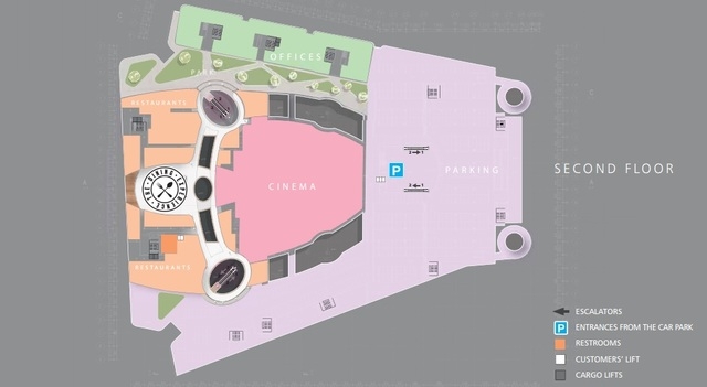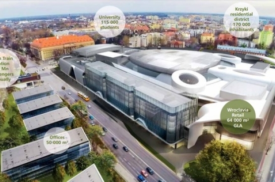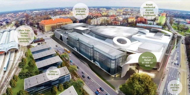 WROCLAVIA OFFICES class A office building is located on the side of ul. Sucha and has two independent entrances with representative reception desks on the ground floor of the building. The building is connected to the shopping center through a green terrace located on the second floor of the complex. The building includes an underground parking lot. Additionally, the building will include a parking lot for bicycles, as well as showers and changing rooms for cyclists. The building is BREEAM (Excellent) certified.