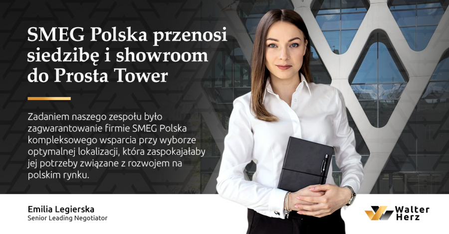 - Zadaniem naszego zespołu było zagwarantowanie firmie SMEG Polska kompleksowego wsparcia przy wyborze optymalnej lokalizacji, która zaspokajałaby jej potrzeby związane z rozwojem na polskim rynku. Szukaliśmy, nie tylko odpowiedniej przestrzeni biurowej, ale również prestiżowego miejsca do stworzenia showroomu marki. Odpowiedniego budynku, którego architektura korespondowałaby z niepowtarzalnym designem produktów oferowanych przez SMEG. Te warunki spełnił biurowiec Prosta Tower, w którym nasza firma również ma siedzibę. Proces najmu przeprowadzony został bardzo sprawnie dzięki zaangażowaniu i profesjonalnemu podejściu wszystkich stron – informuje Emilia Legierska, Senior Leading Negotiator w Walter Herz.