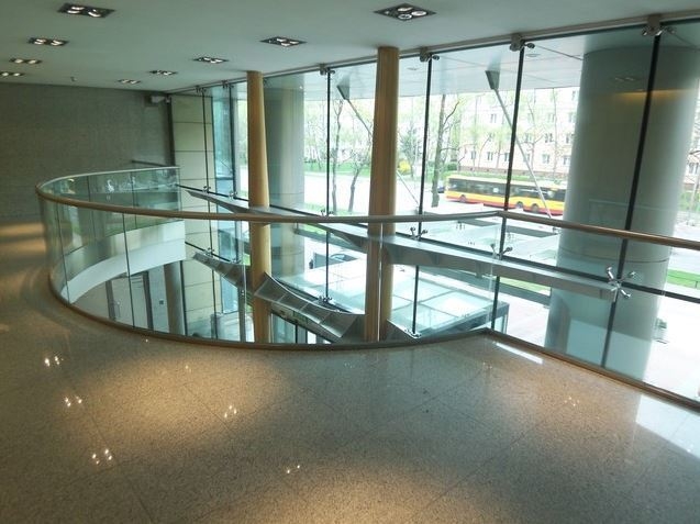 Budynek posiada elegancką fasadę z kamienia naturalnego i dużymi przeszklonymi płaszczyznami, co zapewnia dobrą penetrację światła dziennego.
